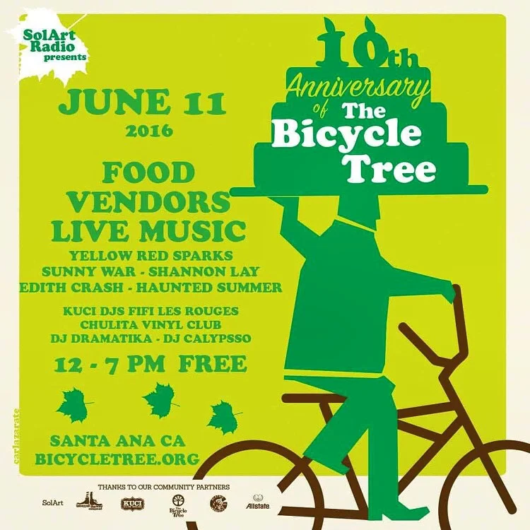 The Bicycle Tree cumple diez años de edad este año! Para celebrar, estamos haciendo equipo con SolArt Radio para un día de música en vivo, comida y vendedores locales! Todo esto se llevará a cabo en el patio y estacionamiento detrás de nuestra tienda, y la entrada es totalmente gratis, gracias a nuestros patrocinadores!